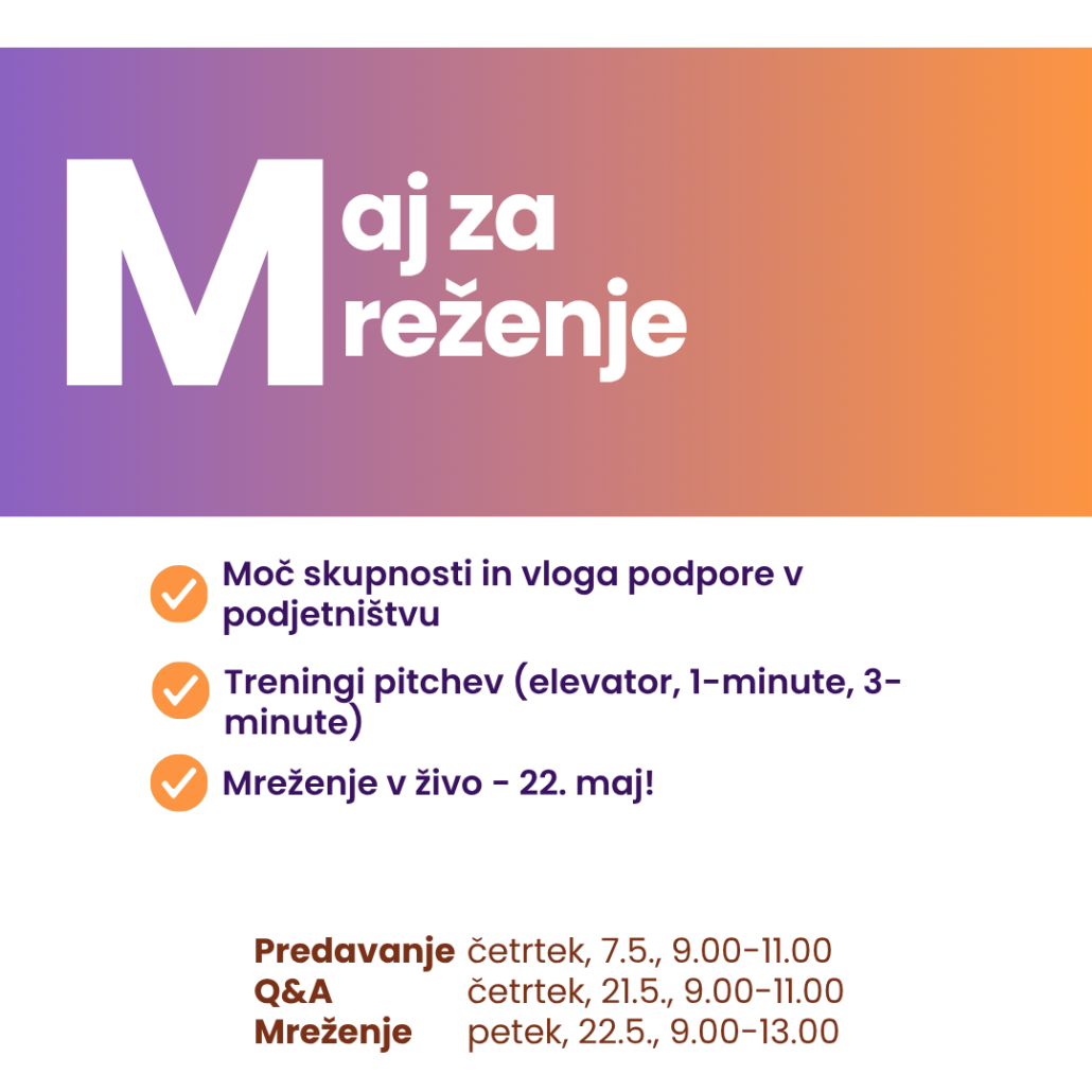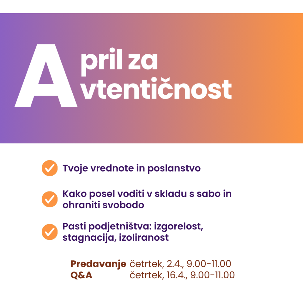 Mentorski program za rast in preboj v podjetništvu bo potekal kot spletna akademija, online. Posnetki vseh predavanj in ZOOMov vam bodo na voljo ves čas trajanja do konca maja, zato da si jih lahko v miru pogledate, kadarkoli in kolikor krat želite. Zaključek mentorskega programa bo v petek, 22. maja, z mreženjem in druženjem vseh udeležencev v živo!