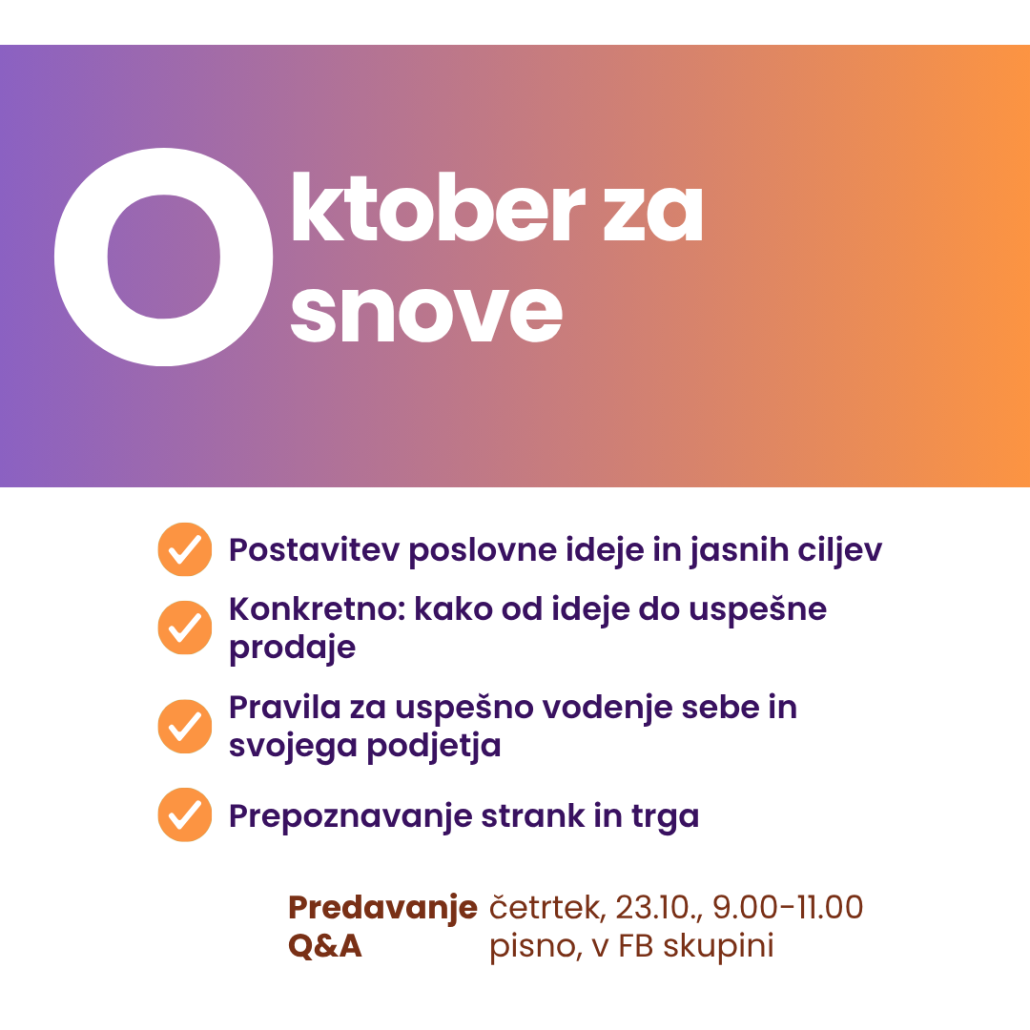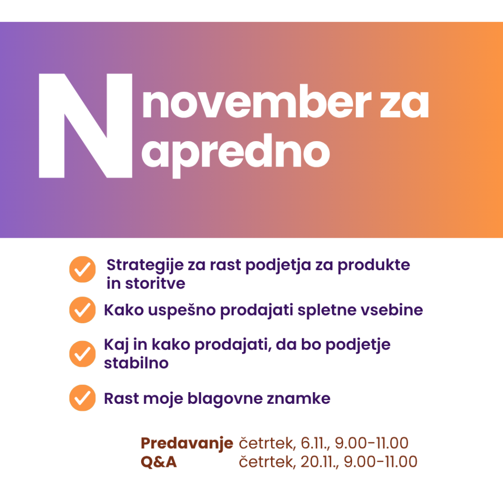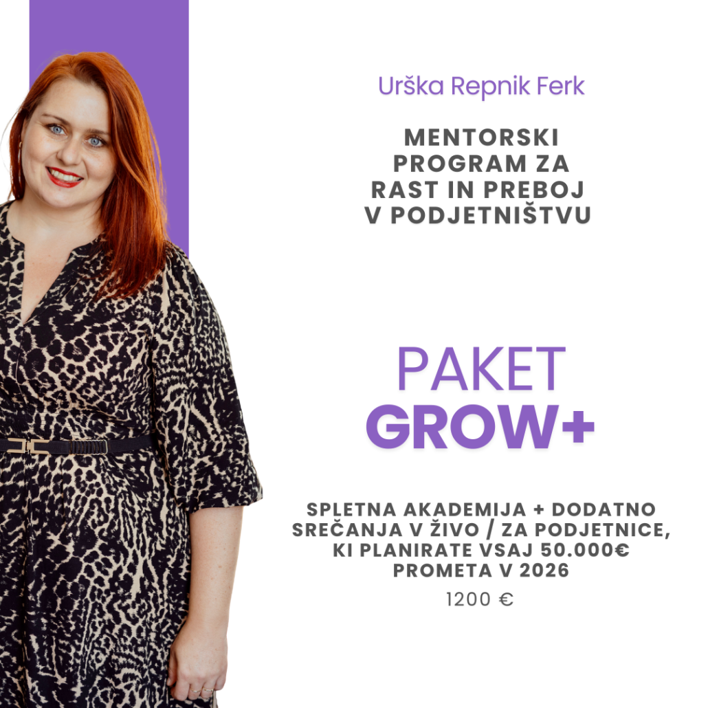 1) Mentorski program za podjetnice Grow+ za vse, ki za 2026 glede na letošnje stanje planirate minimalno 50.000 € prometa: spremljate spletno akademijo, dodatno se srečujemo še v živo, vedno od 9.00 do 15.00 (7. november, 21. november, 5. december, 9. januar, 23. januar, 13. februar, 20. marec, 17. april, 8. maj)