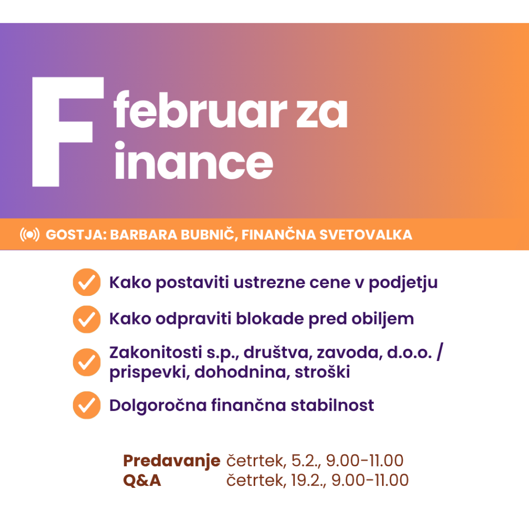 Ravno zato bomo šli skozi ključne stvari, ki jih potrebuješ ne glede na to, ali šele nosiš idejo v sebi, si že nekaj časa na trgu ali pa vodiš podjetje, ki ustvarja več sto tisoč evrov prometa – a imaš občutek, da podjetje bolj vodi tebe kot ti njega. Naučila te bom vsega, kar uporabljam tudi sama, in za kar menim, da je ključno, da kot podjetnik oziroma podjetnica obvladaš.