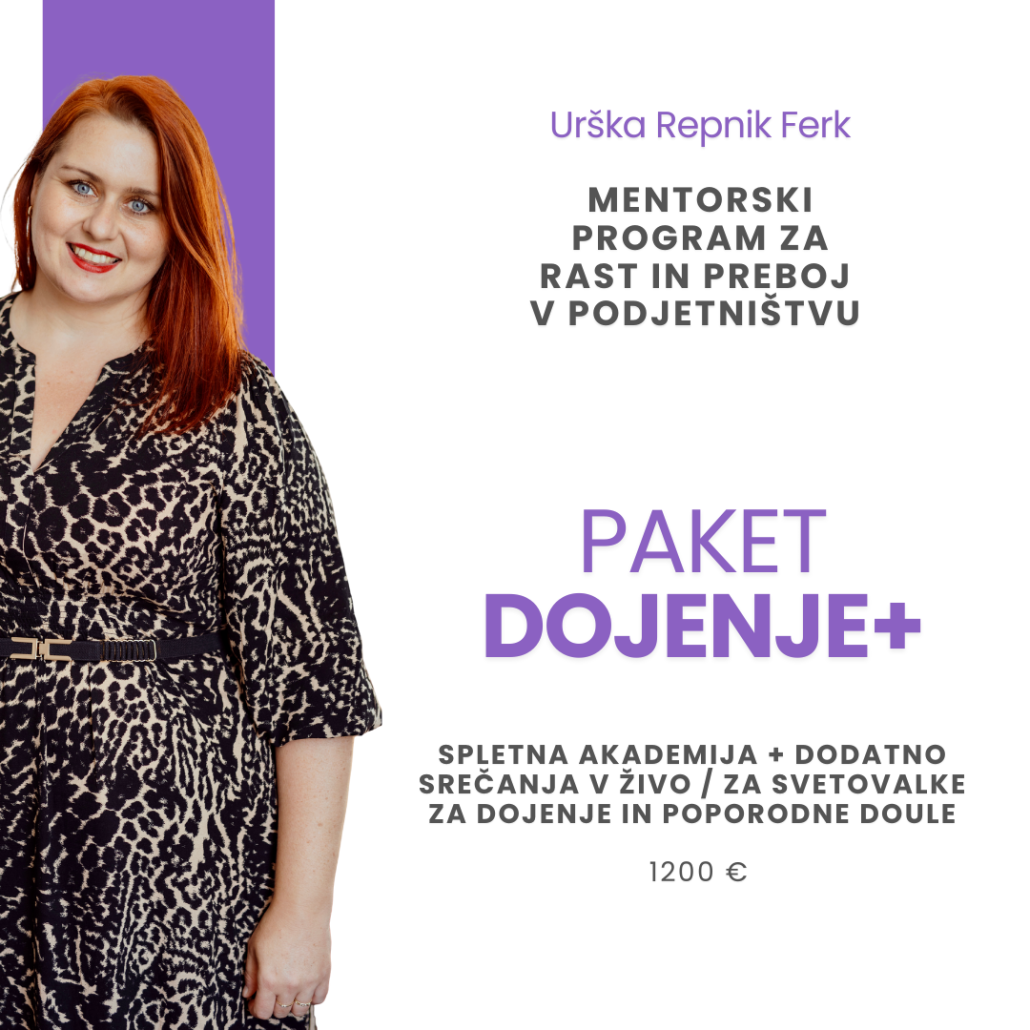 V skupini Dojenje+ bomo delali na vaših poslovnih modelih, hkrati pa vas bom podprla tudi s konkretnim znanjem in izkušnjami, ki jih imam kot dolgoletna svetovalka za dojenje in mentorica svetovalkam – predvsem pa z znanjem in veščinami, ki jih v klasičnih izobraževanjih za obporodne delavce ne dobimo, so pa za uspešno delo z ljudmi ključnega pomena. Bonus: na enem terminu bo predavala Amanda Golob, uvoznica dveh najbolj optimalnih znamk stekleničk za hranjenje dojenčkov, dr. Browns in Lansinoh – o kombiniranem hranjenju, ter Renata Kocbek Mikložič, izjemna kranio-sakralna terapevtka, o vplivu poroda na dojenje ter o izzivih na telesnem nivoju, ki jih lahko rešuje kranio-sakralna terapija. S ponosom bom vključila obe, saj sta zaključili moj prvi mentorski program za svetovalke dojenje ter se vsa leta udeleževali tudi mojih supervizijskih srečanj. Obe sta začeli praktično z ničle in sta sedaj izjemno uspešni podjetnici.