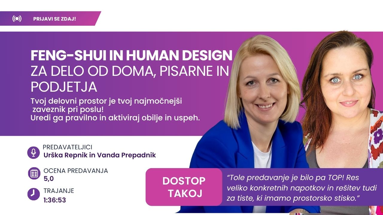 Zate sem zato z Vando Prepadnik ustvarila praktično spletno predavanje Feng-shui in Human design za pisarne in podjetja – kjer ti bova na enostaven, a hkrati izjemno uporaben način predali znanje, ki ga Vanda živi že več kot 10 let, jaz pa več kot tri leta. Poleg razlage ti bova pokazali tudi konkretne primere iz prakse – iz svojega podjetja in iz dela s podjetniki, ki sem jim že pomagala dvigniti poslovno energijo s pravilno postavitvijo prostora.